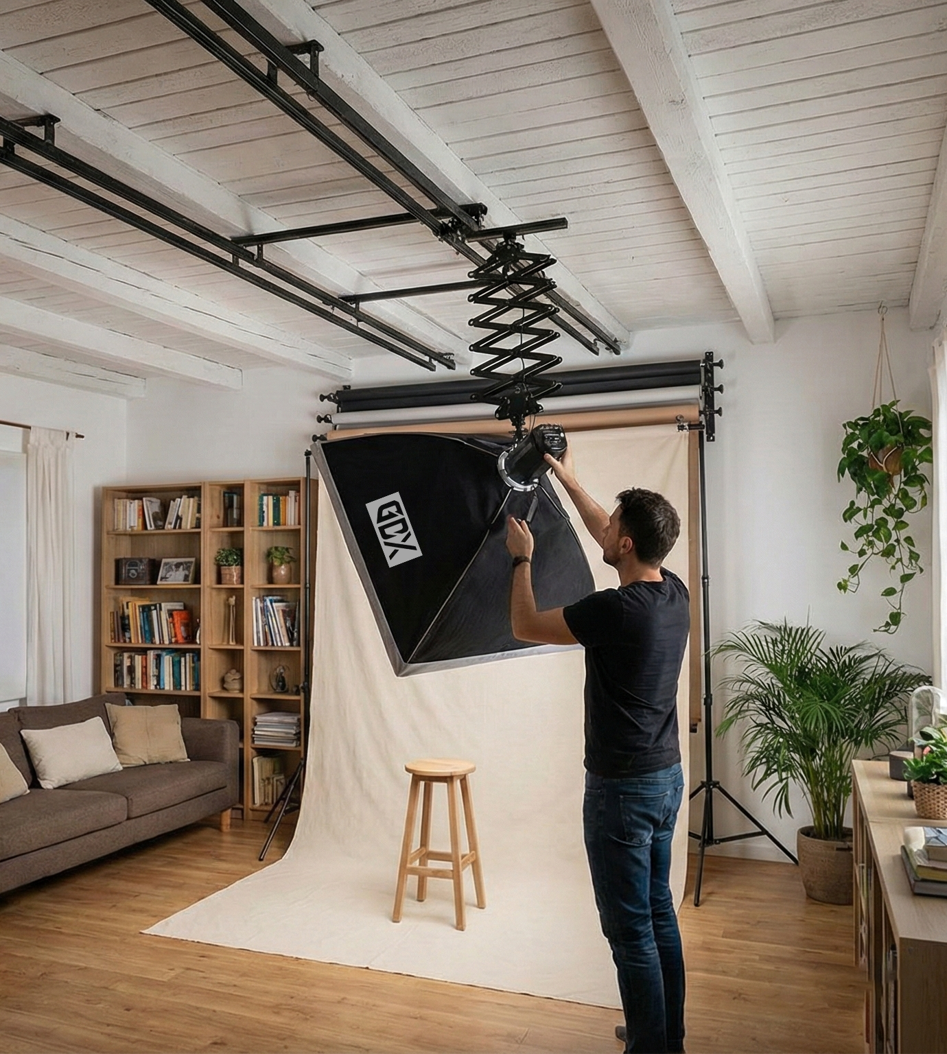 Благодаря кареткам, плавно перемещающимся по осям X и Y вдоль потолочных рельсов, и регулируемому по высоте механизму пантографа (аккордеона), вы можете за считанные секунды расположить источники света в любой точке сцены. Такая конструкция обеспечивает непревзойденный комфорт, особенно при создании повторяющихся световых схем для предметной и модной съемки.